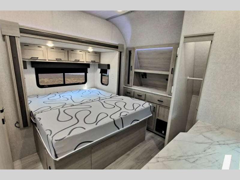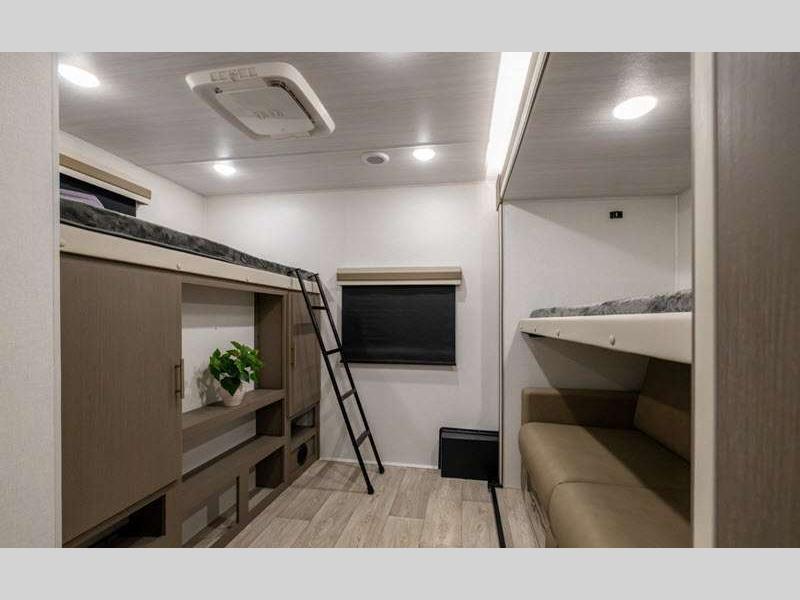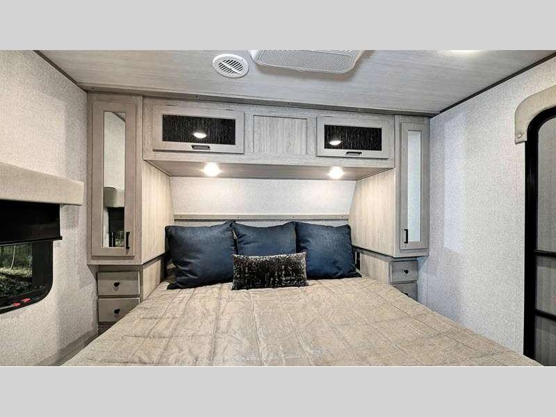 You can make yourself at home with solid pressed membrane countertops, interior LED lights, and black roller shades for added privacy. The outside shower with hot and cold water will let you easily wash off camp gear, and the marine grade exterior speakers will allow you to be the life of the campground. You will also appreciate the universal docking station for easy access to your hookups, plus a high-output on-demand tankless water heater for hot water when you need it.
