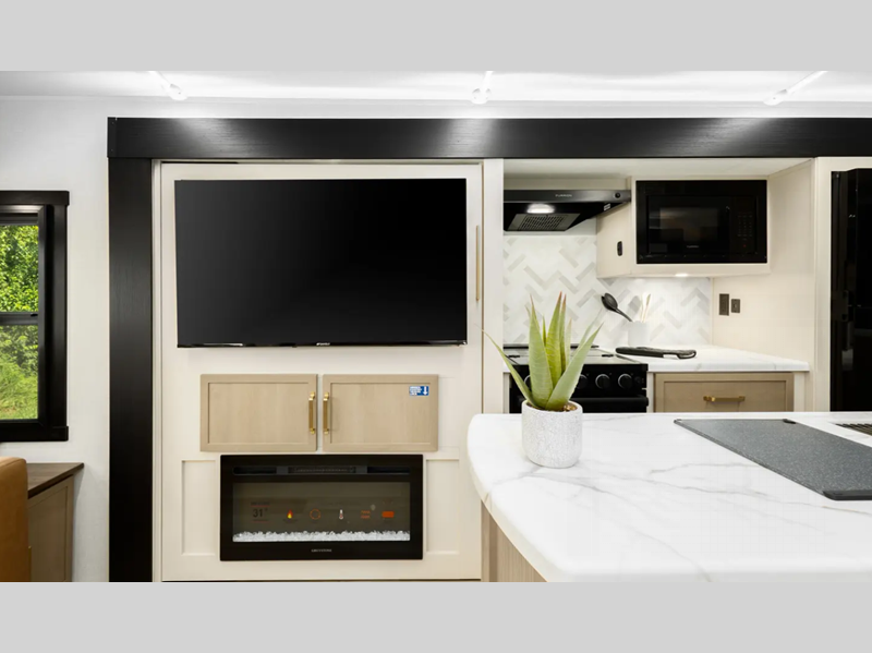Sleeps 3 Slides 2 Length 33 ft 1 in Ext Width 8 ft Ext Height 11 ft Hitch Weight 1160 lbs Dry Weight 8243 lbs Cargo Capacity 1717 lbs Fresh Water Capacity 49 gals Grey Water Capacity 90 gals Black Water Capacity 30 gals Available Beds Custom King Refrigerator Type 12V Refrigerator Size 10 cu ft Cooktop Burners 3 Number of Awnings 1 Water Heater Type On Demand Tankless AC BTU 31500 btu TV Info LR 50" LED Smart TV Awning Info 19' with LED Lights Axle Count 2 Washer/Dryer Available Yes Shower Type Radius Electrical Service 50 amp Similar Floorplans
